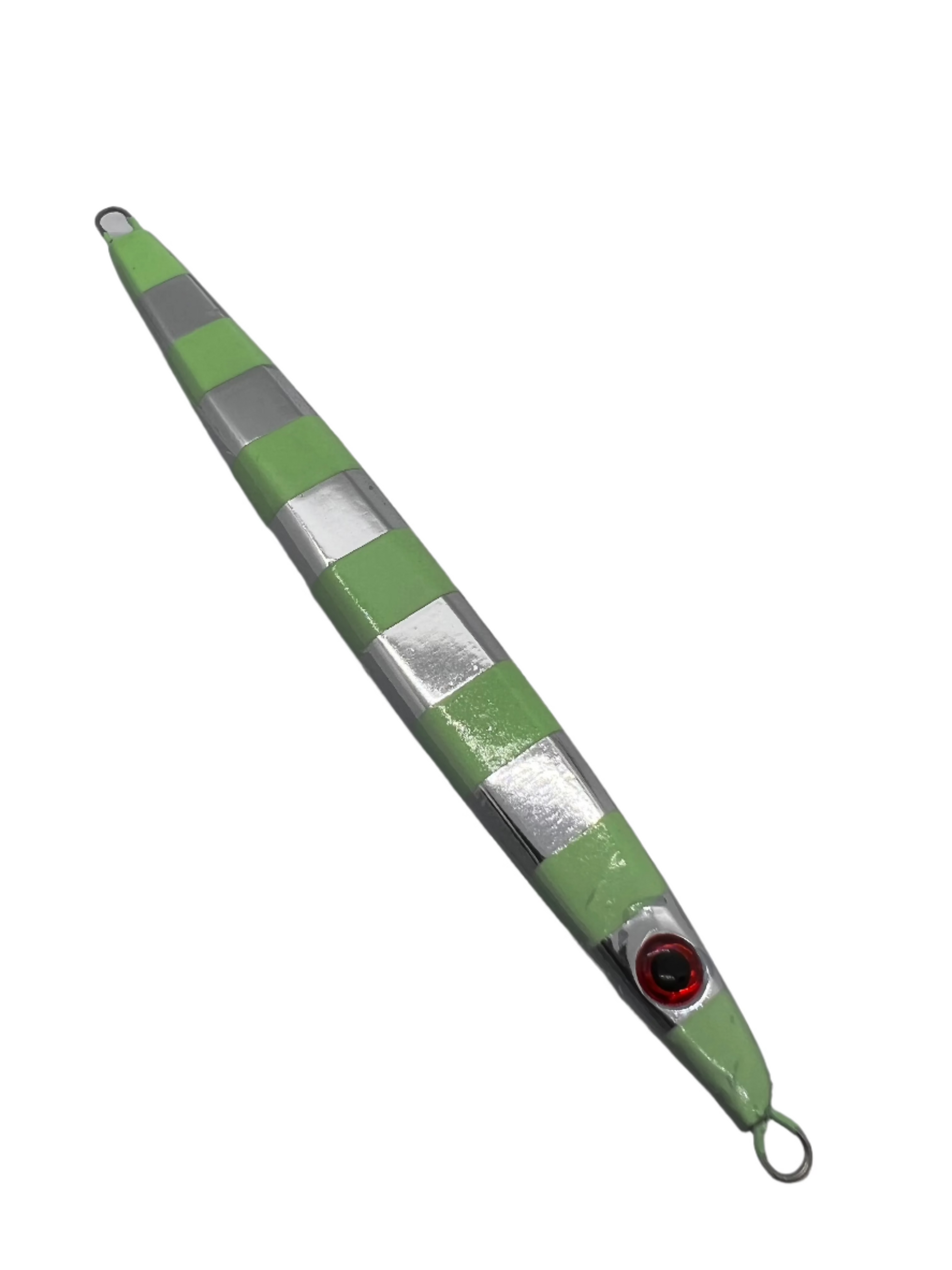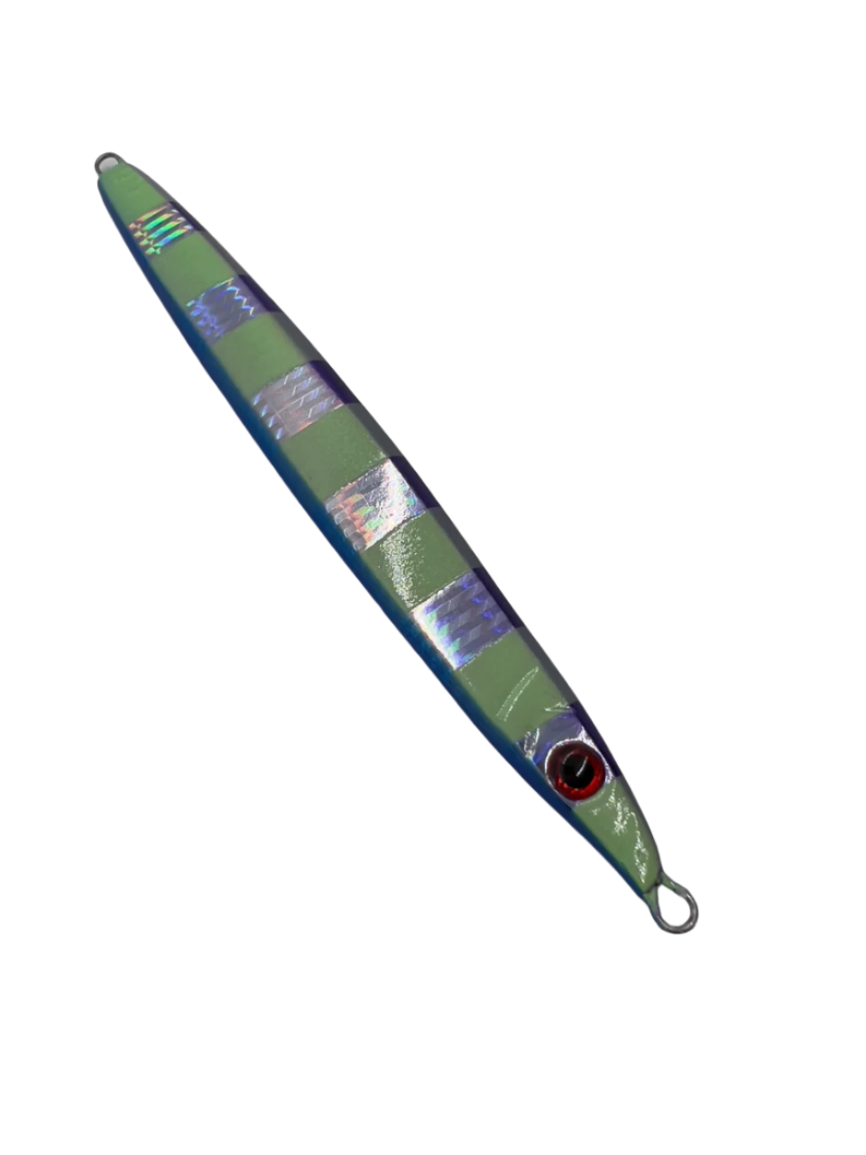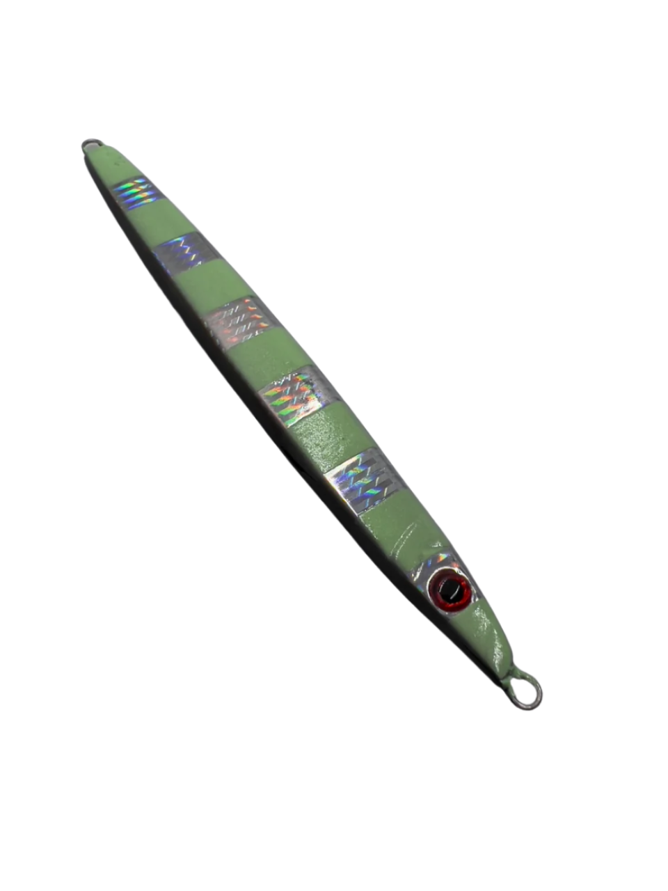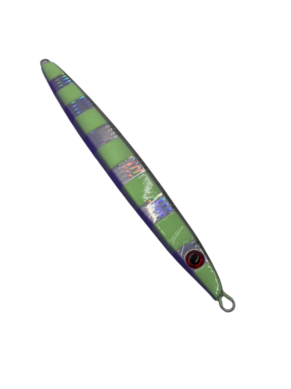 The slender shape allows the jig to fall to the ZONE quickly. When the jig hits current the jig swims horizontally which looks like a bait fleeing. The jig gets bit on the fall as well on the retrieve using a pump and wind method.