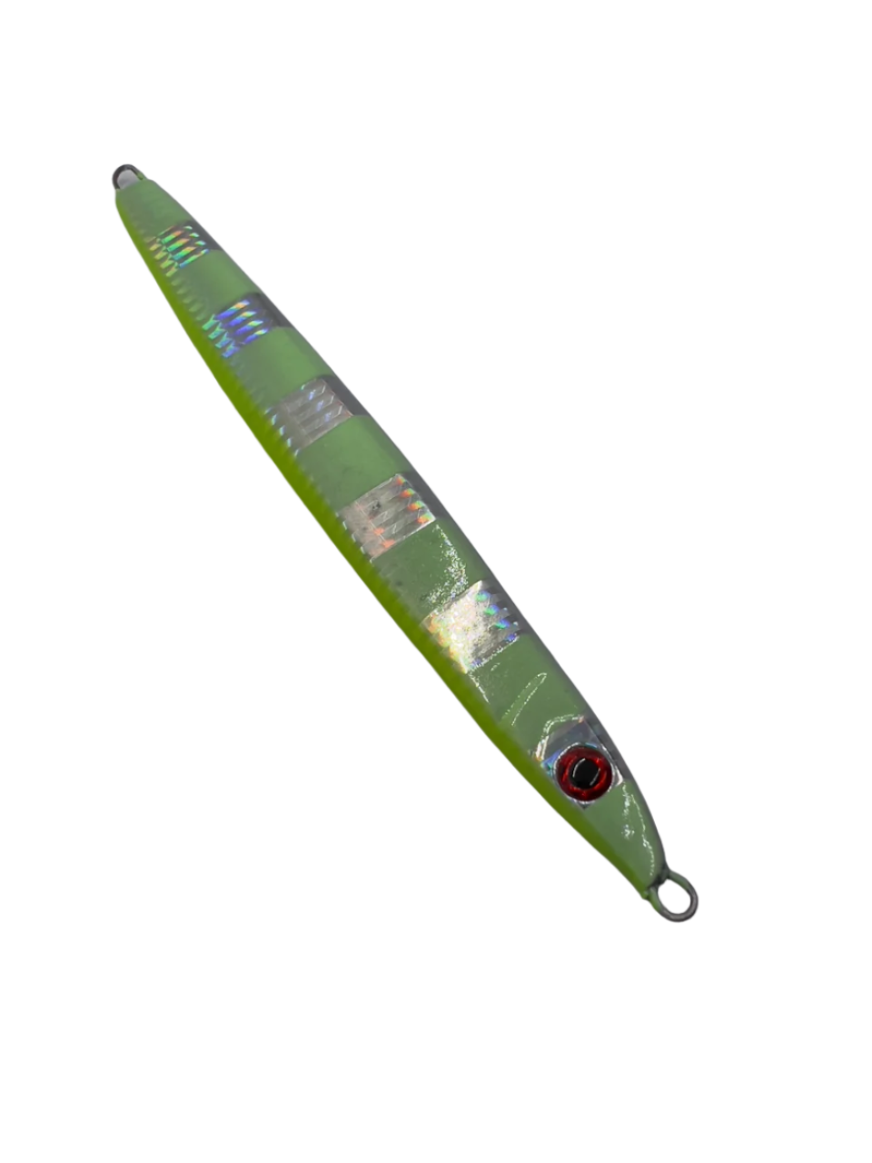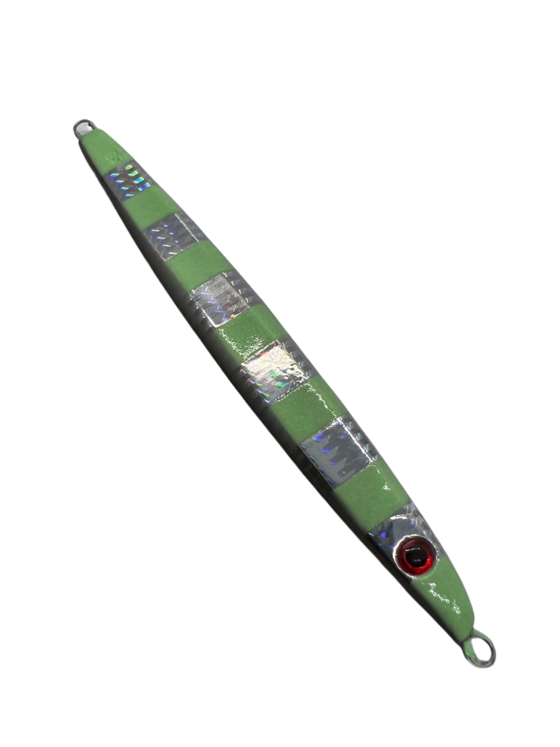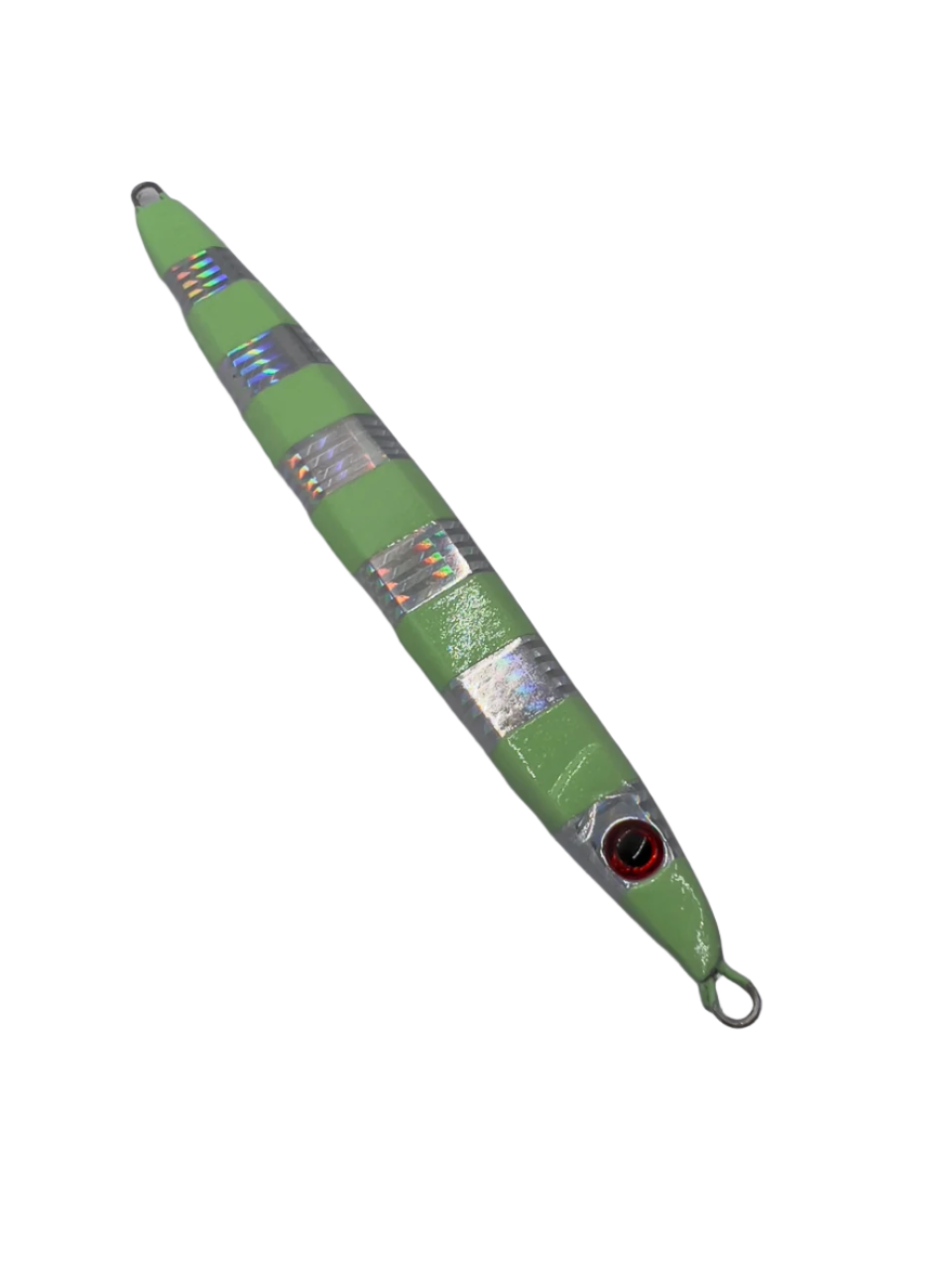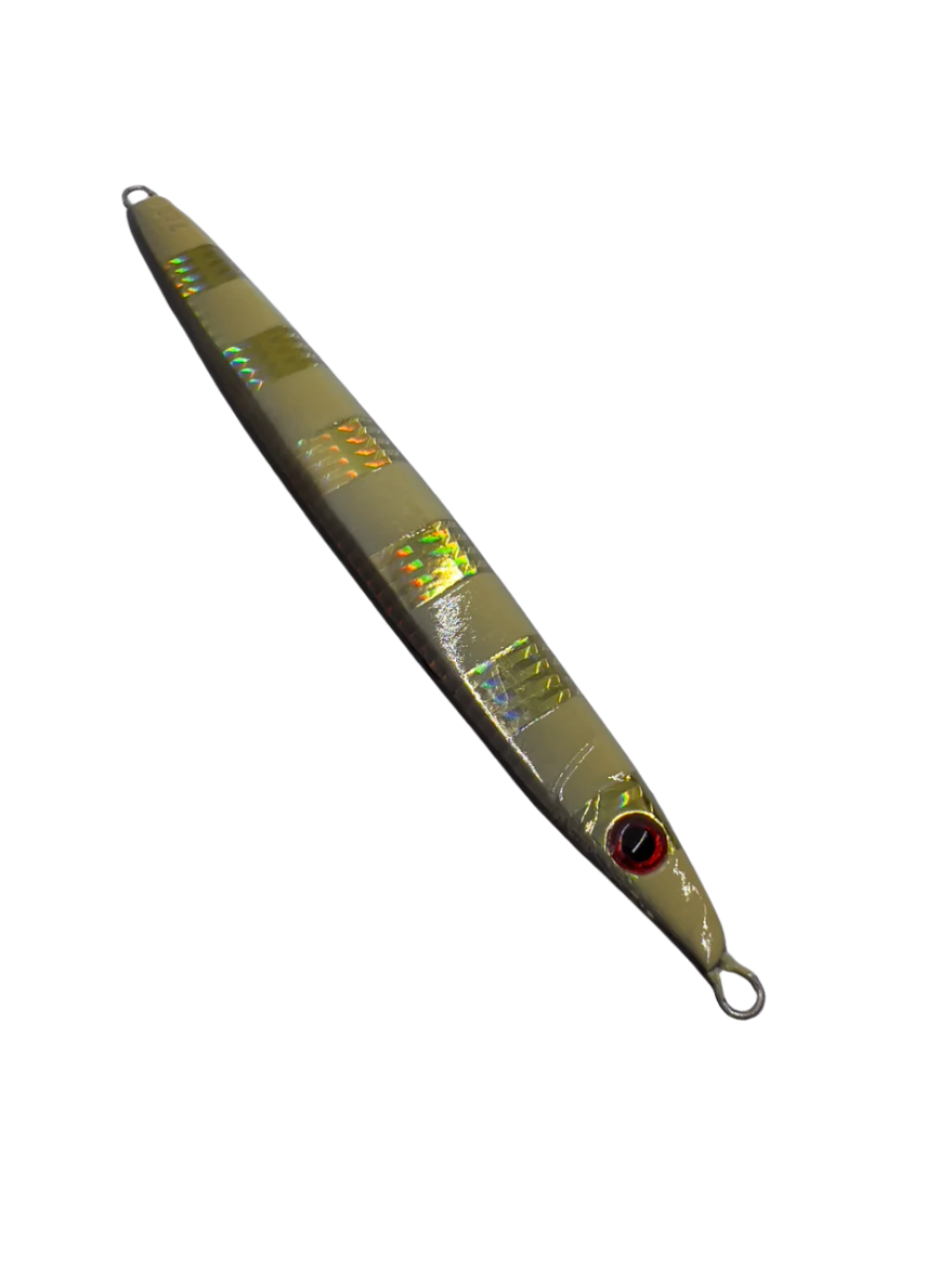 The slender shape allows the jig to fall to the ZONE quickly. When the jig hits current the jig swims horizontally which looks like a bait fleeing. The jig gets bit on the fall as well on the retrieve using a pump and wind method.