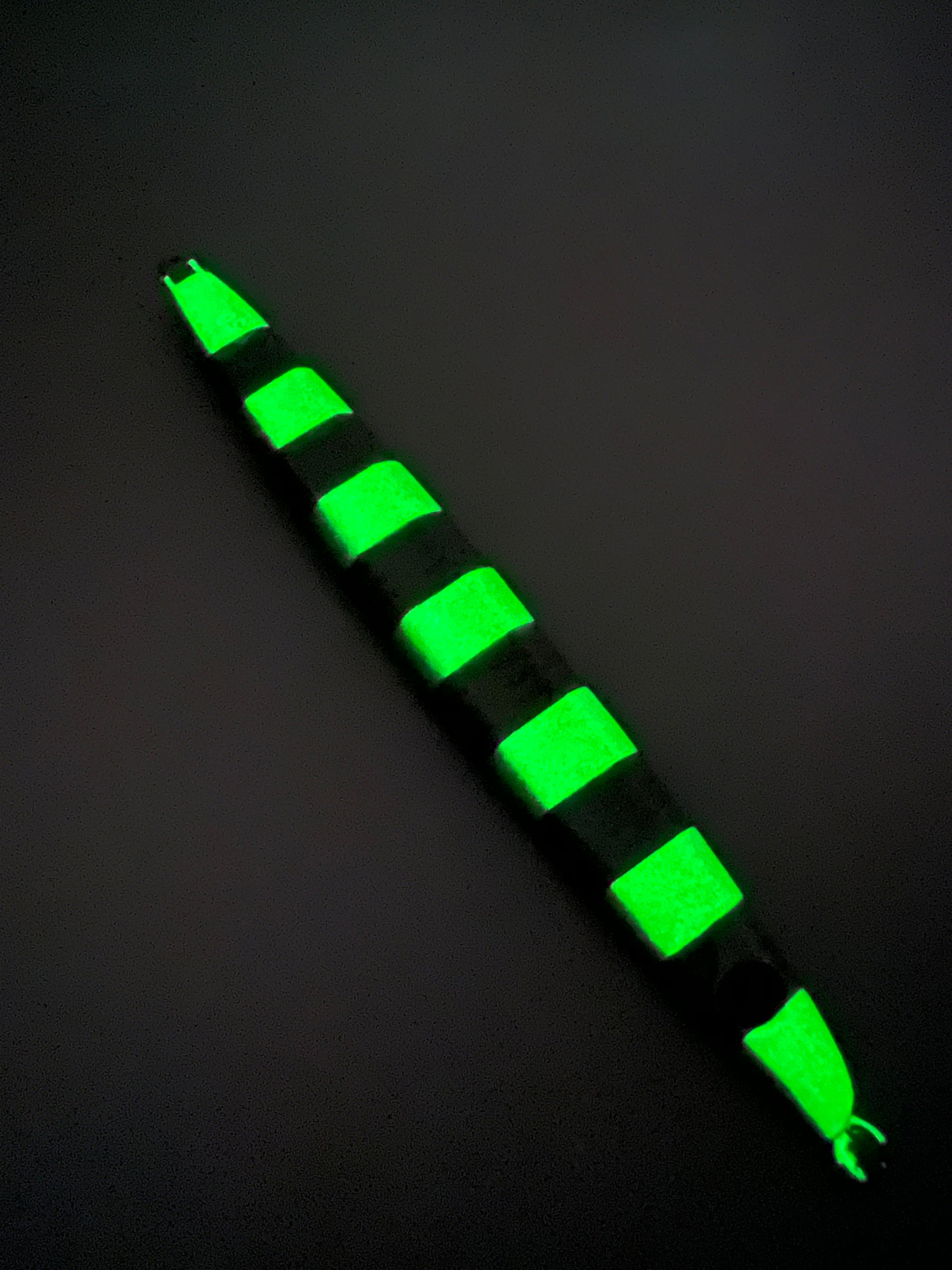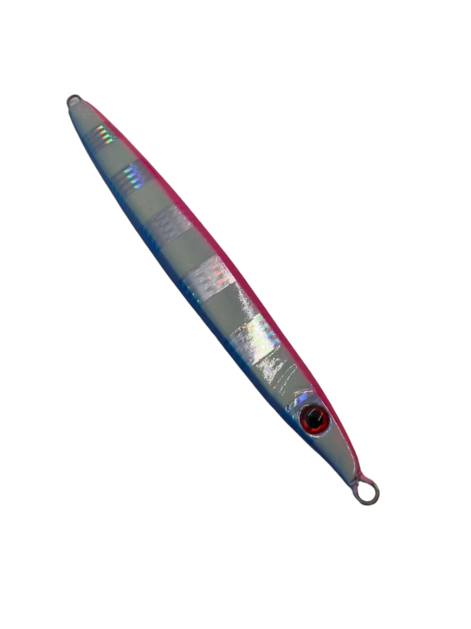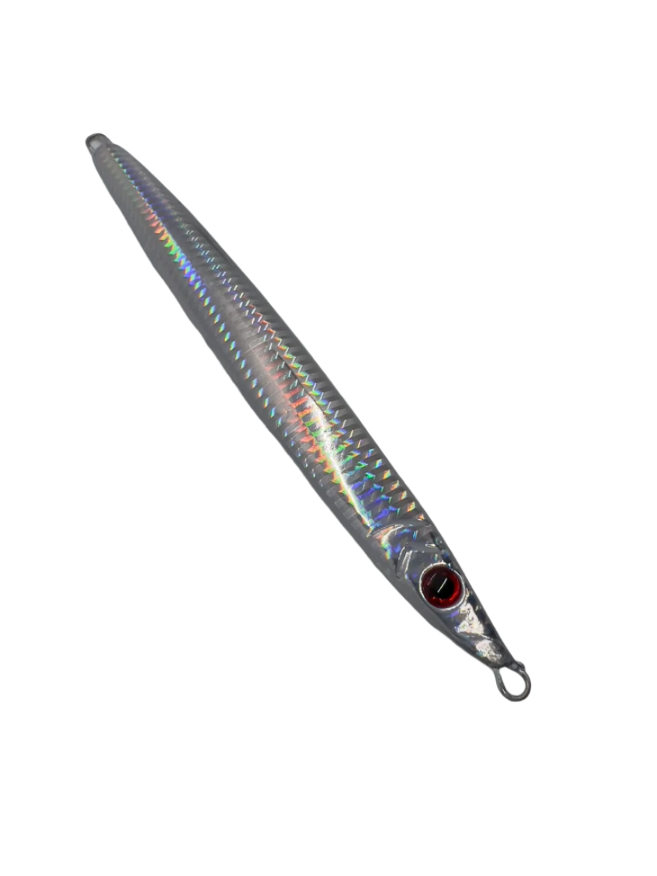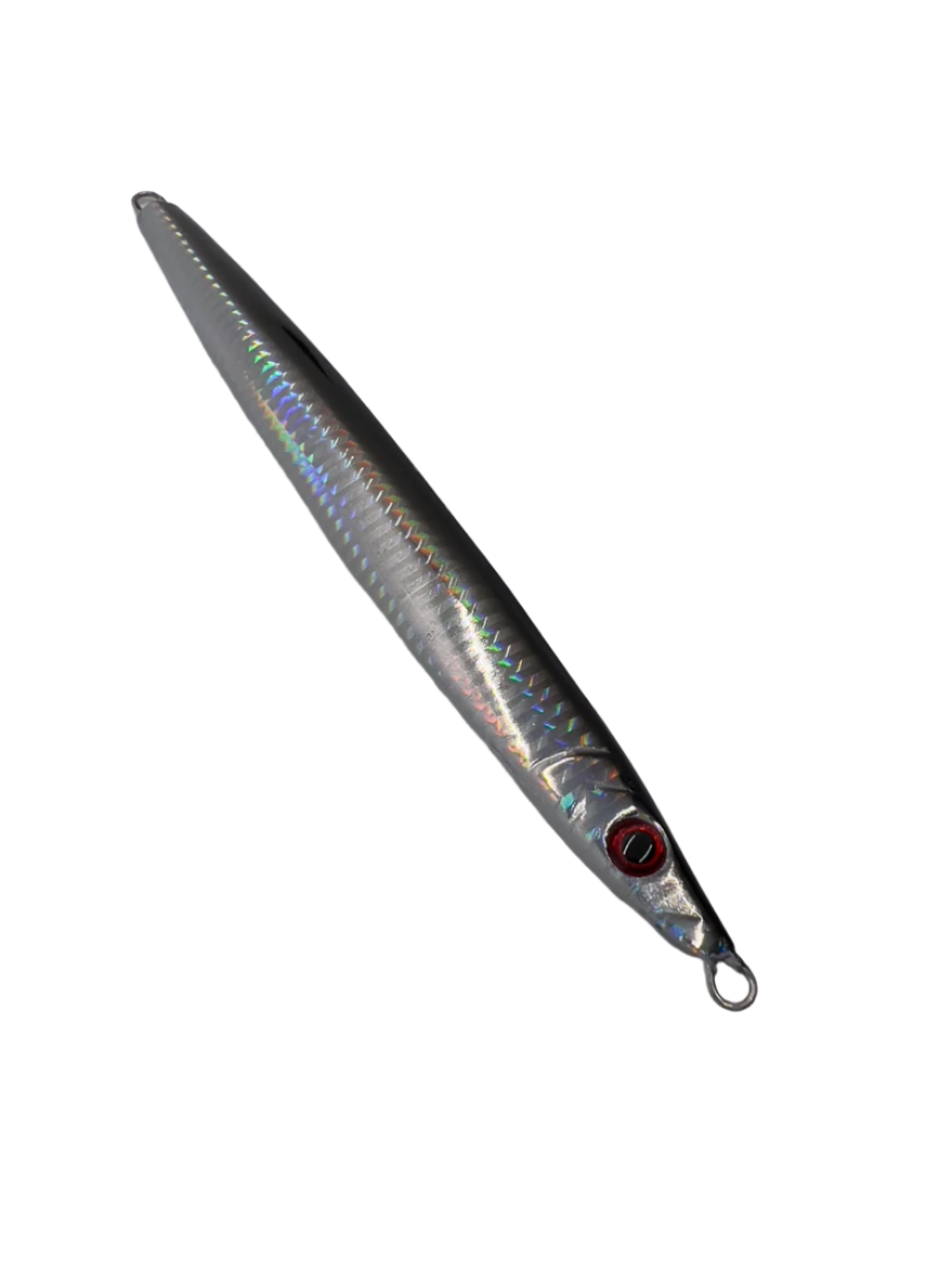 The slender shape allows the jig to fall to the ZONE quickly. When the jig hits current the jig swims horizontally which looks like a bait fleeing. The jig gets bit on the fall as well on the retrieve using a pump and wind method.